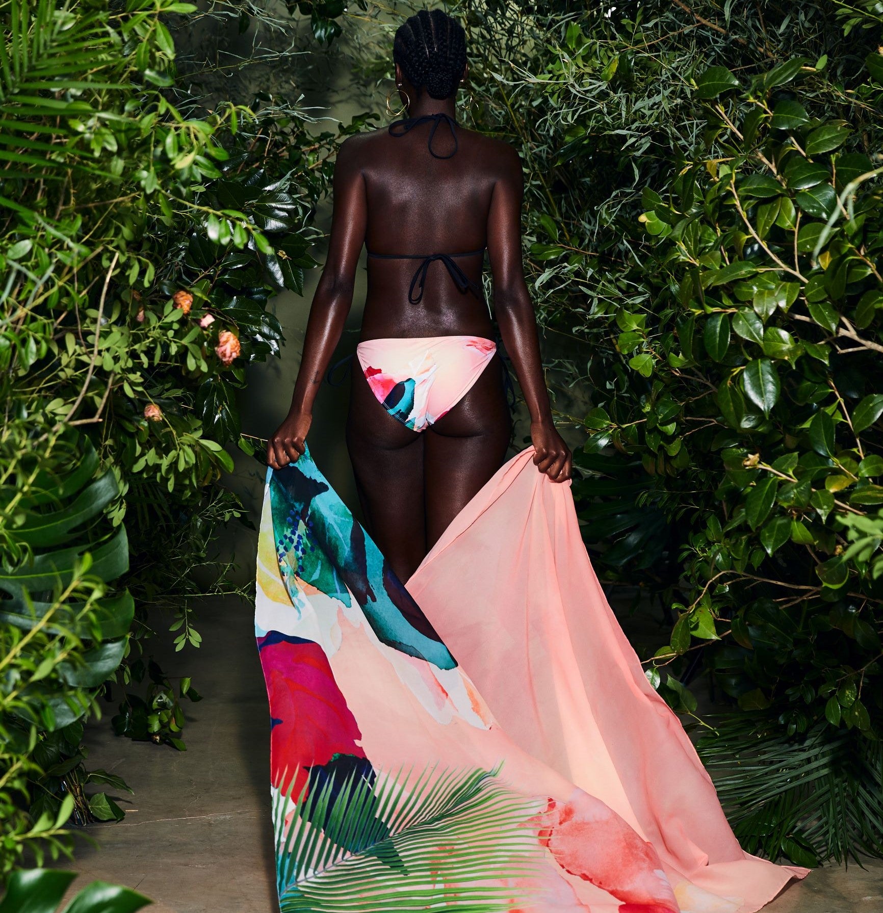 Watercolor based floral classic triangle bikini top offering versatility & tie-waist bikini bottom.